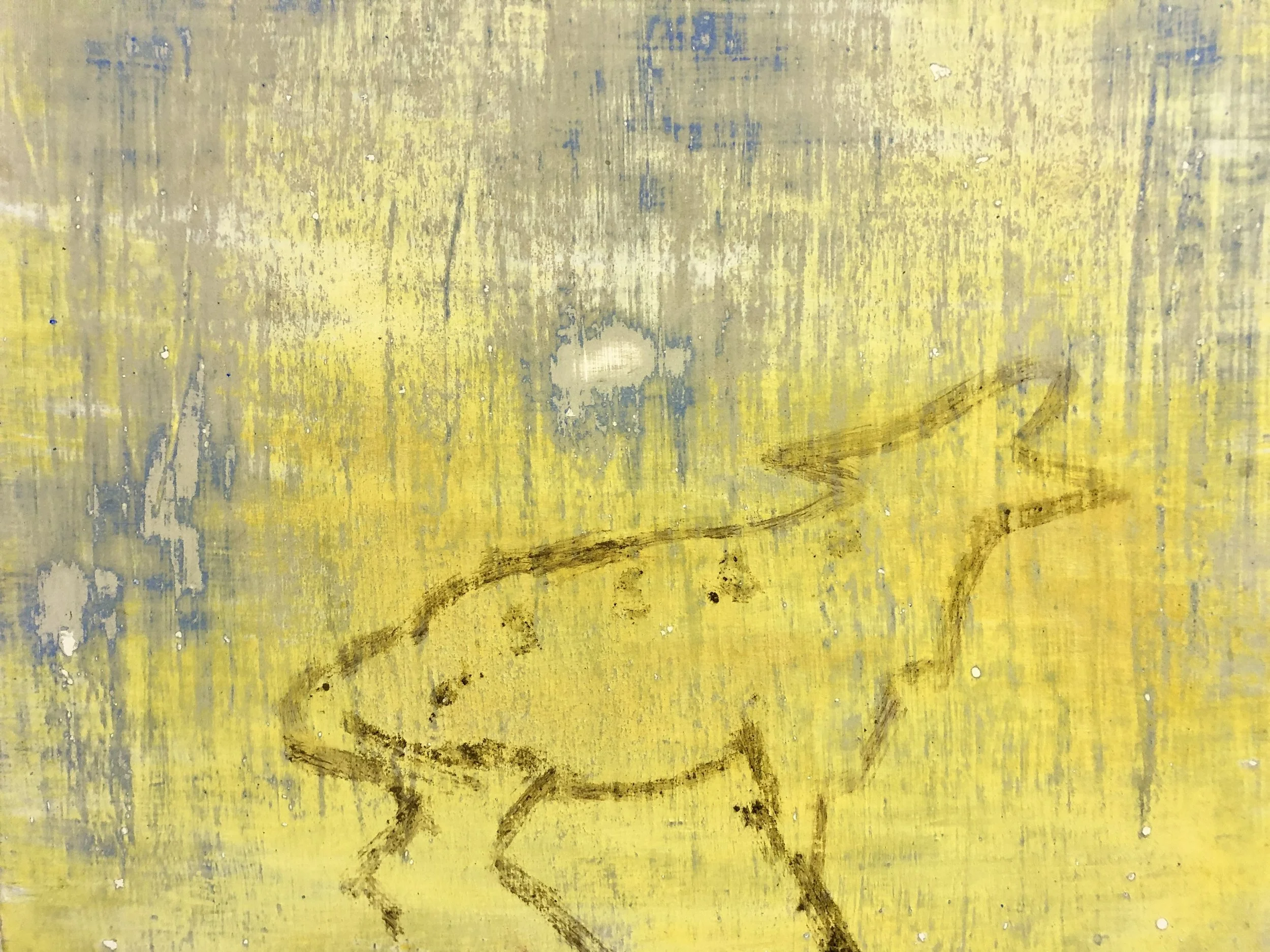 The materials and processes I have used reflect the thematic territory of the work, for example in the first painting, representing the wombic cave or underworld, I have used coal, soil, roots, washed up bones and ground oyster shells. I have excavated and torn through layers to reflect the clawing intensity of the journey from the cave’s darkness into the world of the sun. In the second painting which represents the alchemical potency of fire and blood, I have used ash, red clay and red wine (a symbol for transubstantiation). Red is the colour of passion, which derives from the Greek word for ‘suffering’. I believe we have to let parts of ourselves burn in the red fires of suffering, in order to make space for the new.